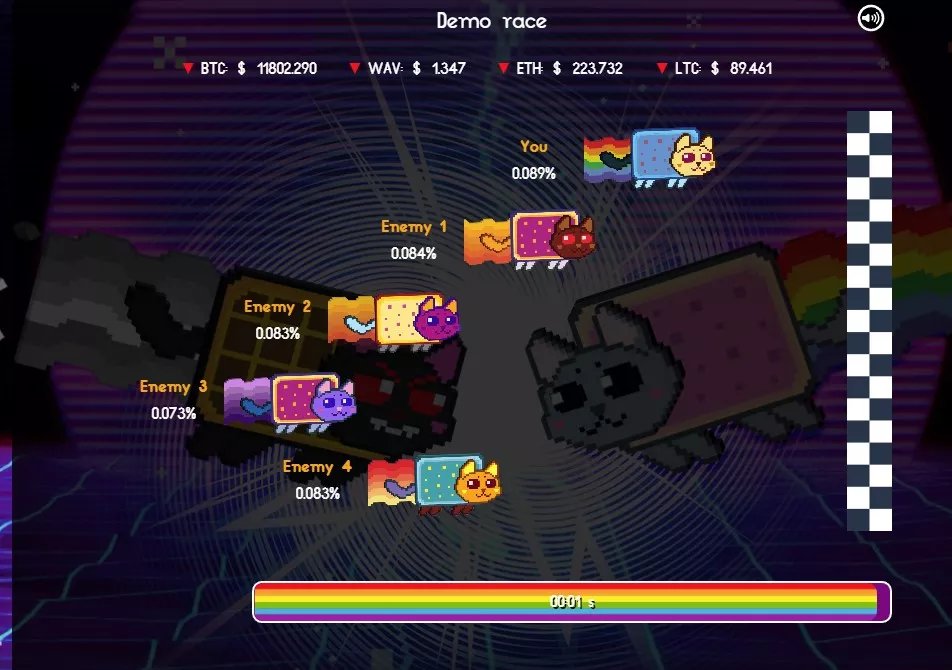レースはcryptocurrenciesパフォーマンスをリードするに基づいて決定され、例えばたとえば、猫のメイン仮想通貨はビットメーターであり、他の猫はライトコイン、ウェーブフィールド、イーサリアムなどです。各レースの時間は60秒で、最小参加額は1wave(現在は$ 1.3)です。Nya Catは、BinanceとCoinmarketcapのAPIを使用して、結果の正当性を保証します。