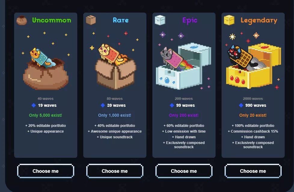 すべての猫には独自のポートフォリオがあり、Wave DEXで取引できるユニークなNFTトークンとして提供されます。Common、Unusual、Rare、Epic、Legendaryなど、さまざまなレアリティで提供されます。Nyan Catをプレイする予定で、いくつかのウェーブを使用する場合は、追加のボーナスが得られます。詳細情報はホワイトペーパーに記載されています。