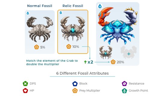 DPS、ブロック、レジスタンス、HP、プレイマルチプライヤ、成長ポイント化石は2種類あります:NormalとRelic。カニの属性にそれぞれ5%と10%のボーナスを追加します。