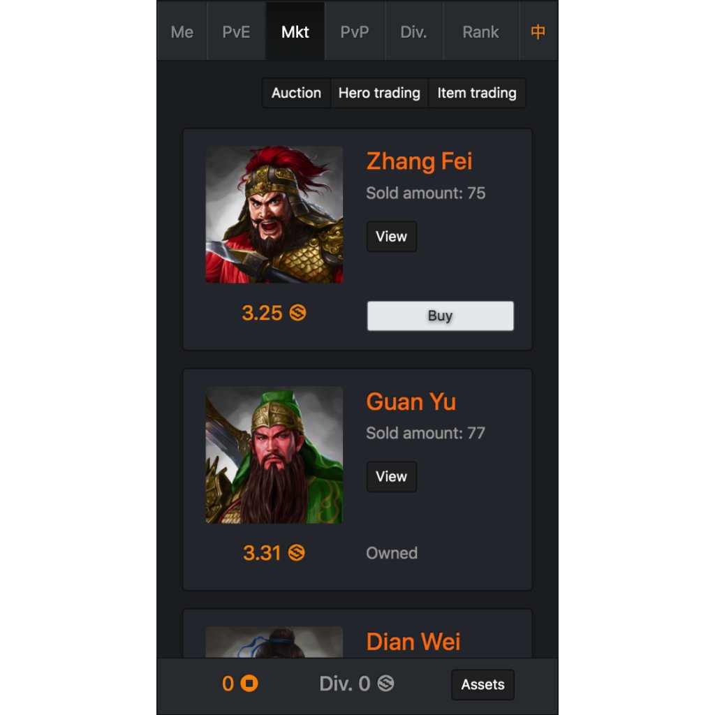 - マーケット:ここでは、プレイヤーは新しく追加されたヒーローをオークションで購入できます。または、他のプレイヤーとピアツーピアで取引します。