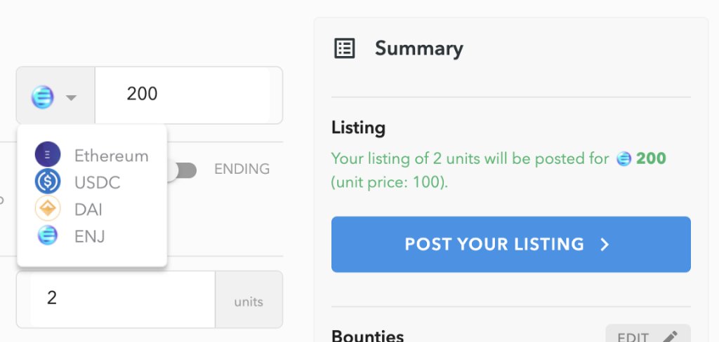 ガスを支払う必要があるのは、アイテムを初めて販売するときだけです(取引のためのトークンの承認が含まれる場合があります)。Enjin ENJ、Sandbox SAND、または別の支払いトークンの販売を希望する場合は、下のドロップダウンをクリックして価格を設定してください。