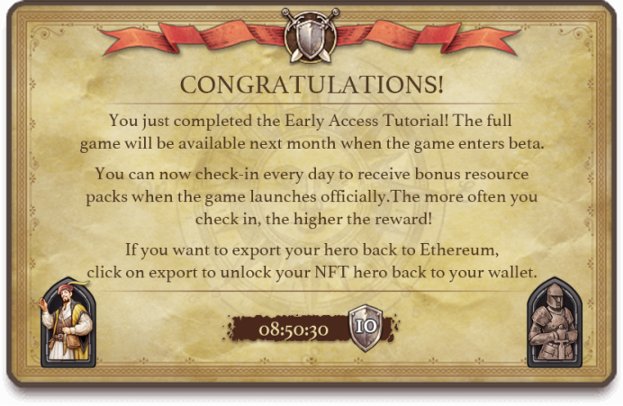 ガイドを終わると、「おめでとう(Congratulations!)」のページを出します。そして、もう一度体験か、ヒーローをETHチェーンへ送信か選択できます。正式リリースすると、初期アクセスを参加した方がリソースパックを受け取ります。そして登録回数によってリソースも追加されます。