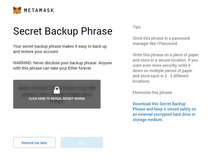 ※復元のワードが無いと、メタマスクを復元できませんので、必ずメモしておいてください!そして、他人には絶対に見せてはいけません。