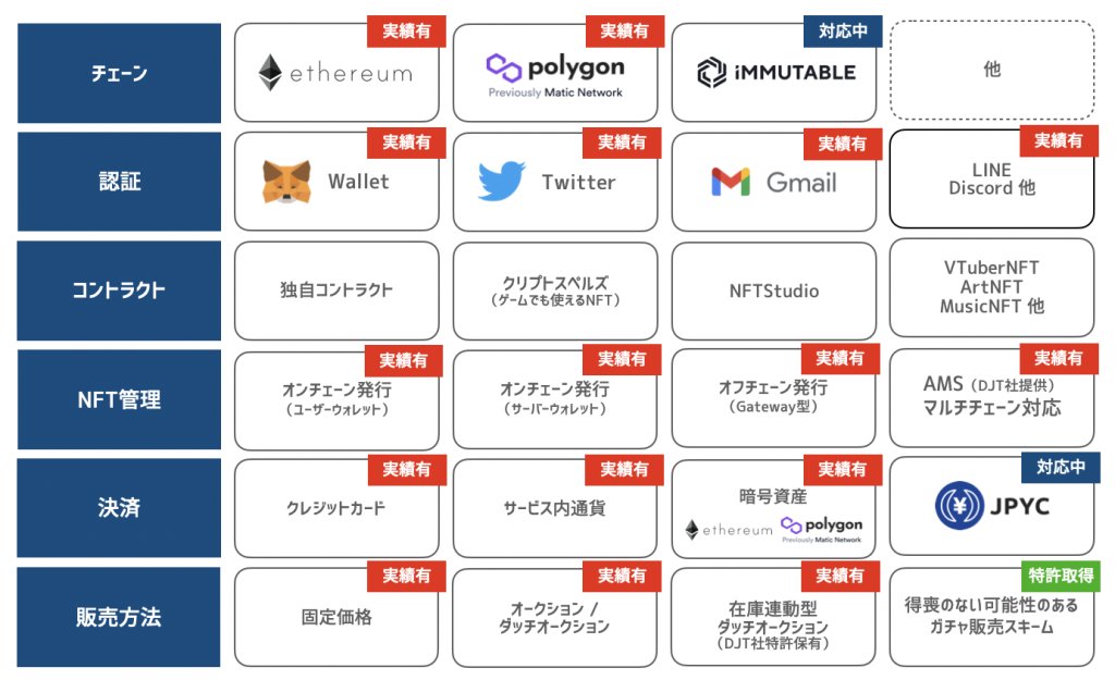 オンチェーン発行(ユーザーウォレット)/ オンチェーン発行(サーバーウォレット) / オフチェーン発行(Gateway型) /AMS(DJT社提供)/ マルチチェーン対応