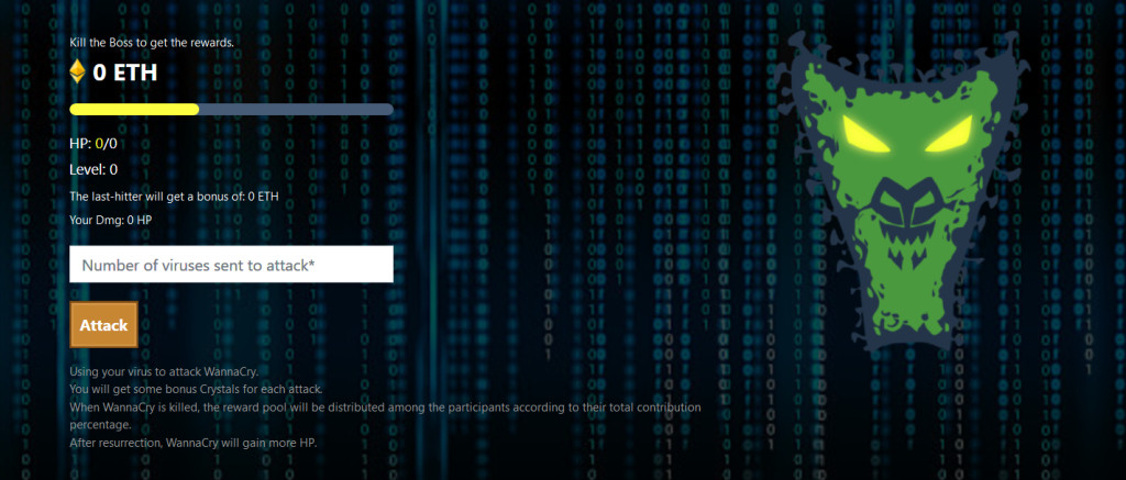 - Boss WannaCryを倒してETHをもらいます。受けたETHの量は、あなたがBOSSに与えたダメージによります。