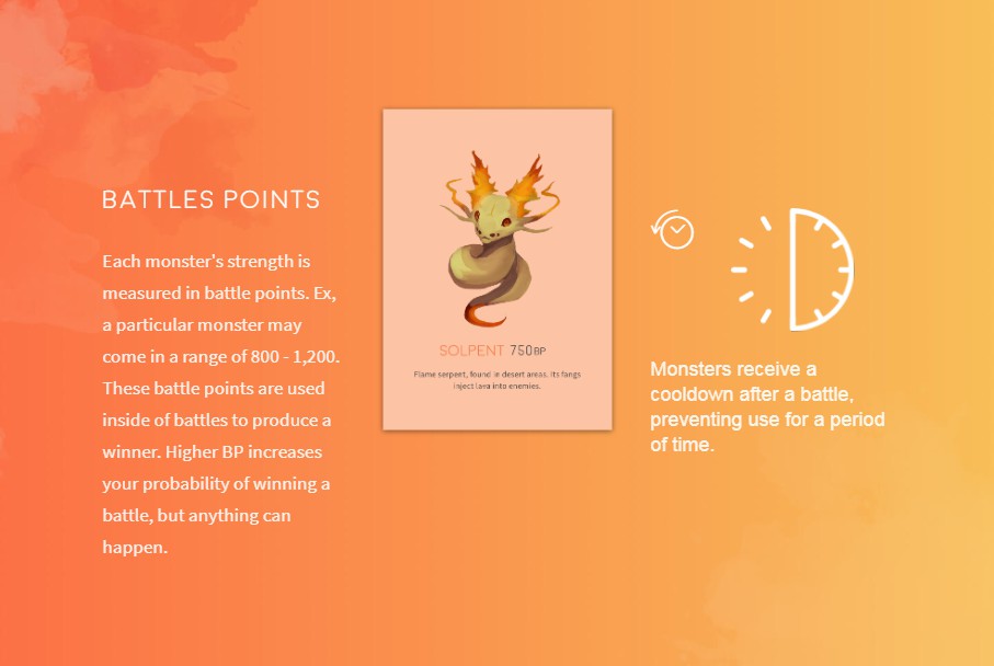 各モンスターのパワーはバトルポイントで測定されます。例えば、特別なモンスターは800~1200ポイントを持っているかもしれません。これらの得点は、勝ち負けの指標として使われます。より高いバトルポイントは勝利のためのより多くの可能性を表しますが、何でも起こり得ます。