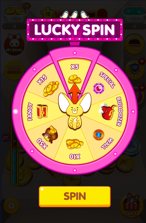 - 両側に落ちたコインはスピンを充電できる。スピンがいっぱいになった時、クリックしてスピンミニゲームをプレイできる。