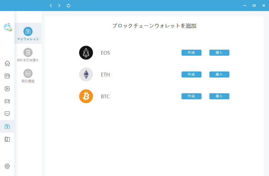 作成したいウォレットを選択して、操作ガイドによってウォレットを作成します。またはウォレット追加可能です。