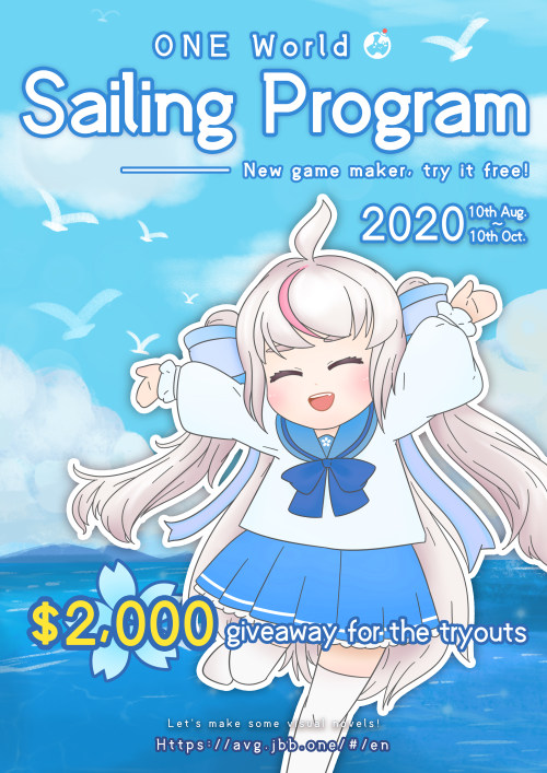 Event Due: 2020/08/10~2020/10/10Welcome to ONE World Sailing Program!This is a two months long event about making visual novel game and then vote by all participants/players. You will experience a new game engine, harvest friendship, get rewards and have all kinds of fun experience. Most important thing is that you have a finished game in the end! Don’t worry if you are only carrying a nascent idea, you can always discuss with friendly community member on the forum site or join our discord