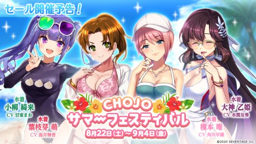 新セール 「CHOJO サマーフェスティバル」開催!ファイター達は水着で登場!8/22(土) 20:00 〜 9/4(金) 23:59までの期間中『CHOJO』内のSHOPにて開催される『CHOJO サマーフェスティバル』についてお知らせです!※販売開始後72時間はCHOJO PRIMEユーザーのみが購入できます。※販売方法は在庫連動型ダッチオークションとなります。※開始価格に付きましては、各レアリティごとに前回のセールで販売したファイターの平均終値の70%とします。『CHOJO サマーフェスティバル』にて登場する4種類のファイターをご紹介いたします! 大神 乙姫(CV:水間友美)「皆さん可愛らしい水着ですわね、 わたくしには及びませんが」レアリティ EPICタイプ GRPLV.MAXパラメータHP 333 / DEF 116 / SPD 171STR 100 / GRP 120 / THR 100PASSIVE SKILL 炎天下が造る影自身が戦闘に出た時、3ROUNDの間、味方全体は敵のスキルで状態異常にならない。ARAWARE 鮮やかな青を汚す紅味方全体のDEFが20%