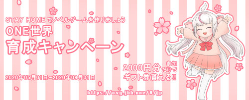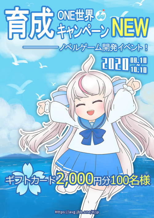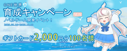 おはよう世界——!ONE世界です~!あのねあのね、最近ね···うちはさ···新しい機能たくさん実装しましたけど・・・想像パワー足りない!!成長したくてもパワーが弱すぎて成長できないなんです(´;ω;`)そのため、みんなの力をかしてほしいです!想像パワーを生み出せれる作品を開発すれば、報酬も貰えるしONE世界もどんどん強くなりますよ!!この機会に想像パワーでONE世界を育成しましょう! 企画概要期間中、ONE世界の開発ツールを利用してノベルゲームを開発する限り、BBCコイン報酬も限定バッジも、さらに2000円ギフトカードをプレゼント! 期間2020年5月01日00時00分~2020年8月01日00時00分(日本時間) 対象作品 期間中、ONE世界の開発ツールで制作して、本サイトに掲載して頂いた作品。ONE世界開発ツール使用時のテクニックをシェアする記事。複数作品参加可能。 報酬 ・参加