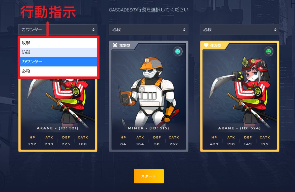 선호하는 행동을 고른 뒤 スタート를 클릭하고 전투 매칭을 한다.