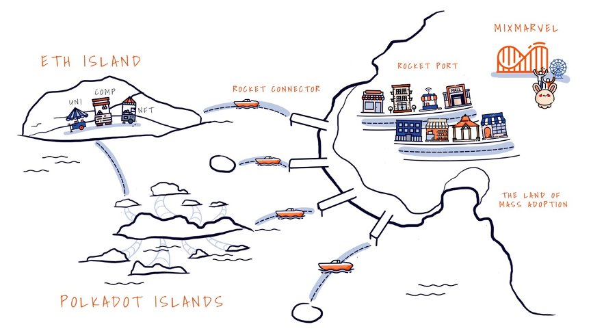 MixMarvel 孵化的火箭协议 1.0 版本基于以太坊的 Layer-2 扩容解决方案,最初应用于当时的 Top 1 区块链游戏云斗龙《HyperDragons》; 经过多个版本迭代和功能升级,目前火箭协议即将推出 2.0 版本。作为可以实现 EVM 体系多链合约互操作的高性能链群,火箭协议 2.0 融合了跨链协议、NFT 协议以及 EVM 协议,并在此基础上进行了扩展,使得开发者能够自由的创建适配各种场景的复杂去中心化应用,同时给予用户近似互联网应用般的体验。如果把当下的以太坊 DeFi 生态比作金融中心,那么火箭协议意图打造的,就是一个娱乐中心。