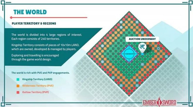 画像を見たらわかると思うんですが、<Ember Sword>の世界は四つの区域と分けられている。中心で居るの青い区域は、'村'と命名されて、開発グループに支配されています。そして、'村'区域を含めている緑色の区域は、'ランド'と呼ばれて、プレイヤーが購入することができます。