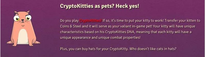 さらに面白いのは、本作と<CryptoKitties>のコラボ企画です——この企画に基づいて、もしプレイヤーは<CryptoKitties>をプレイしたことがあったら、自分が持っているキティを<Coins and steel>の世界に転送して、ペットにすることができます。