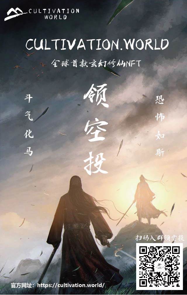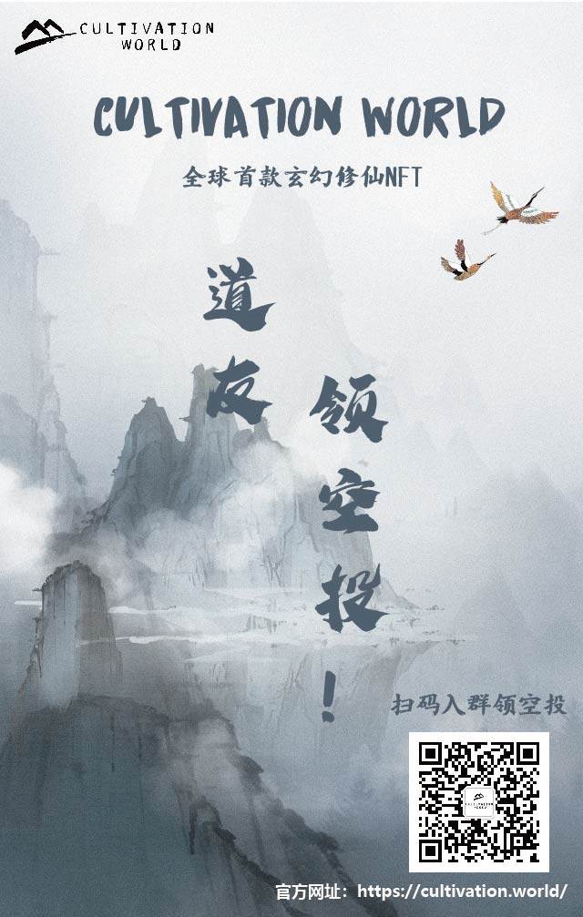 NFT游戏《Cultivation.World》空投来啦!这是全球首款以玄幻修仙为主题的区块链游戏,用户可以抽取来自不同位面的各种角色,将其质押到矿池修炼获取灵石(即CWD代币),或在坊市中互相交易。角色可以通过拜师加入门派加速修行,也可以与其他道友斗法一争高低,据说后期还会开放升仙大会与合体双修等更多经典修仙玩法。