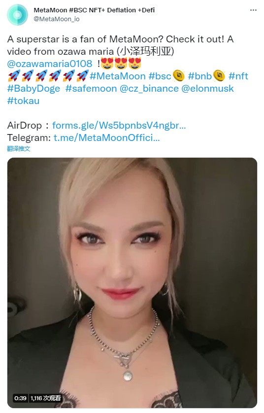 基于BSC币安智能链的 MetaMoon 又官宣了一位新的合作女星,小泽玛利亚!MetaMoon NFT市场预计将于近日上线,届时将有多位人气女星NFT上线!